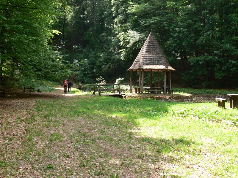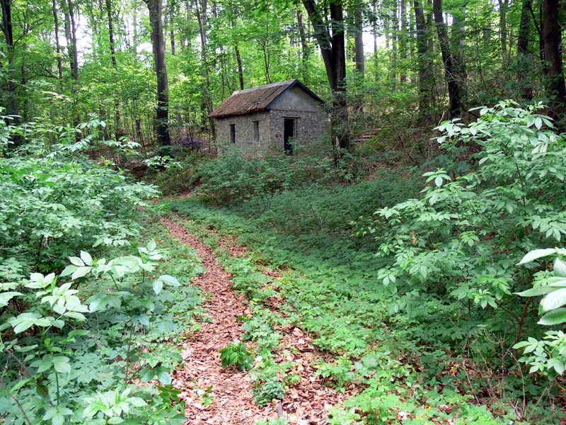 Na, ez meg mi? Csőszkunyhó? Vegyszerraktár? Falusi focipálya vizeldéje? Nem találod ki: vasútállomás! Mégpedig a Diósgyőr-Mahóca közötti, csipkerózsika-álmában szendergő erdei vasútvonalé. Ezen a vonalon járnak vonatok - évente akár kétszer is, amikor fanatikus vasútbarátok ezt megszervezik - de sajnos idáig egy ideje nem tudnak a vonatok eljönni mert egy felhőszakadás utáni áradat két helyen is megrongálta a síneket, még évekkel ezelőtt (egyszer azt is megmutatom!). Hidd el, az avar alatt ott lapulnak a vékonyka sínek! A mesebeli tisztásra lépcső vezet, itt már érdemes körülnézni, forrás, tűzrakó helyek, és egy kis „szigeten” álló esőkunyhó várja a fáradt túrázókat. Mármint azokat, akik nem átallnak akár két órát is gyalogolni, hogy ide eljussanak. Mi amíg lehetett a vonattal jöttünk, így egy órával megúsztuk.