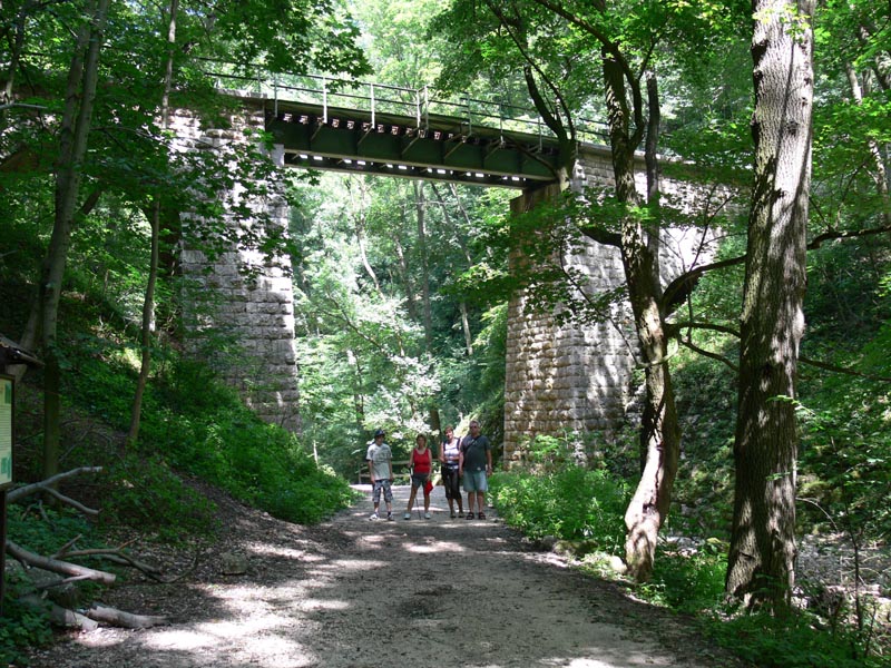 Az 1890-es években készült, a bakonyi fa, szén és a makkon nevelt sertések szállítására, a krónikák szerint ezek az ágazatok virágzásnak indultak a vasút nyomán. Az ország legszebb tájon futó vasútvonalának tartják, különösen a Cuha-patak völgyében futó jó néhány kilométert. Három éve utaztunk rajta, Veszprémből Vinyére és vissza. A mély szurdokban futó patak mentén csodás túraútvonal vezet, fent a völgy oldalában fut a vasút, időnként magas hídon átváltva a másik oldalra, és nem hiányozhat az alagút sem. Elsősorban turisták utaznak rajta.