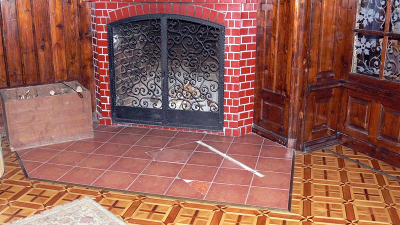 Az Afrika-terem kandallója, előtte a kastély "védjegye", a titkos csapóajtó