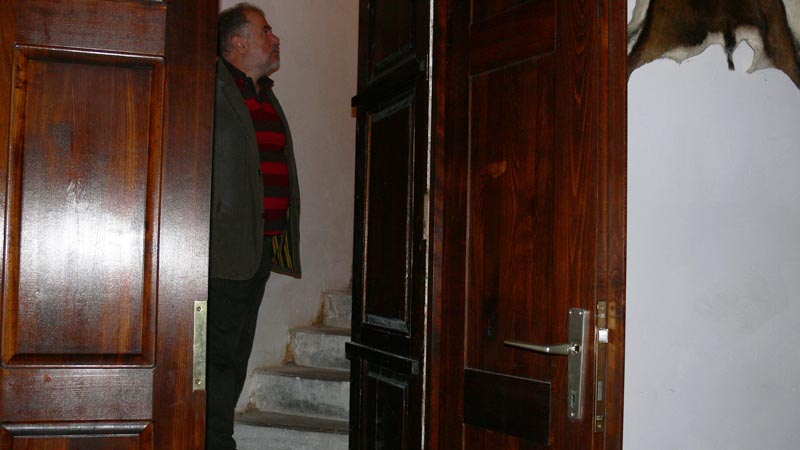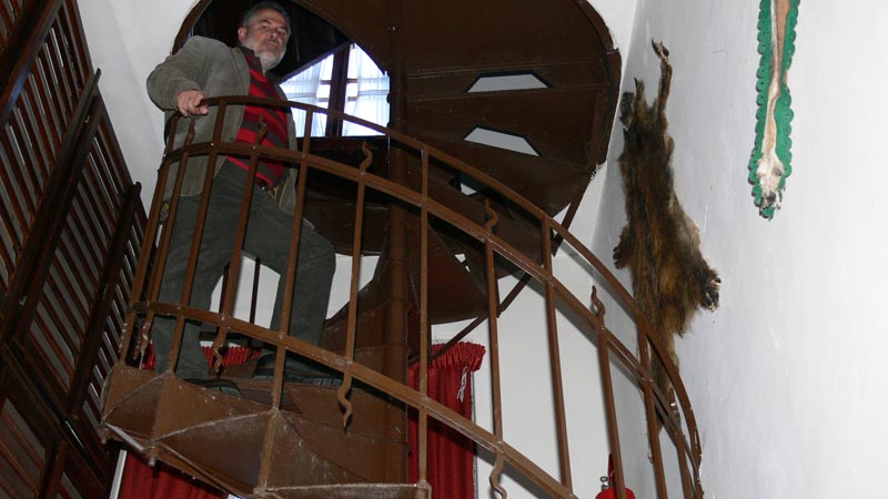ajtó, ami egy míves csigalépcsőt rejtő lépcsőházba vezet. Először felfelé