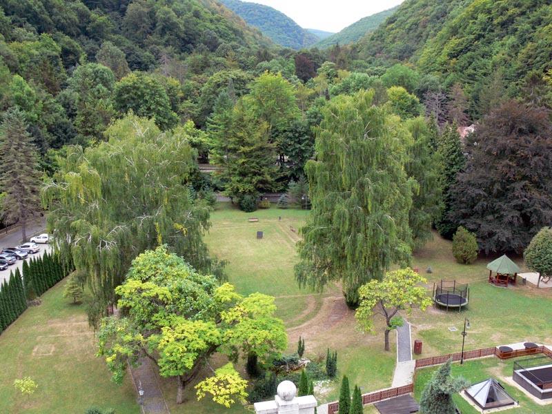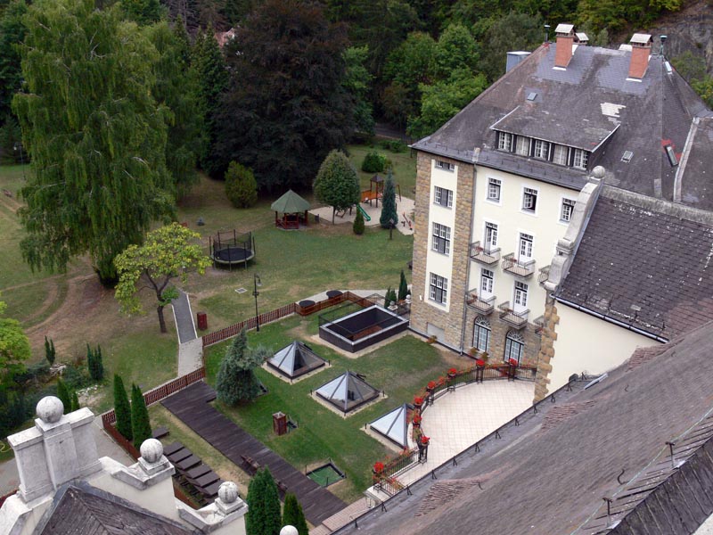 A szálló déli udvara, mögötte a kisvasút lillafüredi állomása.