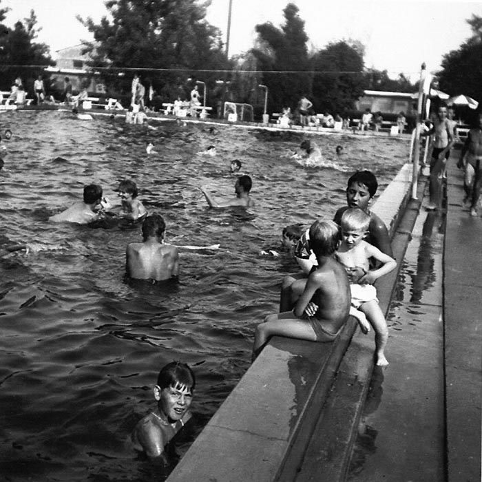 1959. július 1-én, szerdai napon, 8 óra 19 perckor (nem vicc !). A medence feltöltve, a napernyők kinyitva - hamarosan 9 óra, akkor van nyitás.