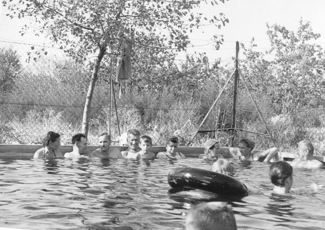 Indulhattál egyenesen a "Nagyba" azaz az úszómedencébe. A 33 méter körüli medence egyik végén 120 cm, másik végén 200 cm mély volt. Már ha tele volt: sokszor megesett hogy nagy örömünkre éppen töltötték, és csak feléig-harmadáig volt vízzel. Nekem ez az állapot tetszett a legjobban: a sekély részen bokáig érő vízben lehetett sétálni, a medence mélyebb felében jó nagy falfelület kínálkozott a labdajátékokhoz, pl. az igen népszerű doppler-hez, vagy a kiszorító-hoz. Ezekből alkalomszerűen bajnokságok is voltak, a tét természetesen sör, amit a meccs után a vesztes fizet, de igen demokratikusan mindkét fél vállt vállnak vetve iszik. A játék a parton lévőktől is komoly figyelmet igényelt - a labda néha ágyúgolyóként süvített, hason találva pl. a mindenkinél elszántabban napozó Hegedűs tanító nénit. Voltak a gyári brigádok között kiírt "igazi" vízilabda bajnokságok is, kapukkal, rendes labdával, fehér és kék sapkákkal. Ilyenkor a mezőny háromnegyed része mindig a sekély részre eső, kisebbik térfélen tartózkodott, mivel nem tudtak úszni...