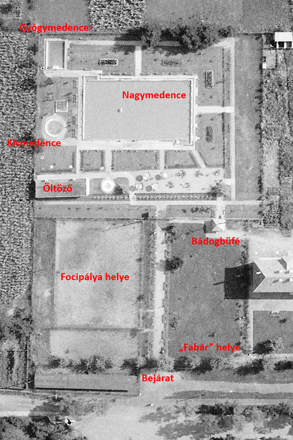 Készült egy nem szabványos méretű, hét pályás, kb. 33 méteres úszómedence, egy langyos vizű apró, kör alakú gyerekmedence és egy forró vizű gyógymedence. A további kényelmet öltöző, kabinsor, zuhanyozó, padok székek és asztalok, no meg egy bádogbüfé szolgálták.
