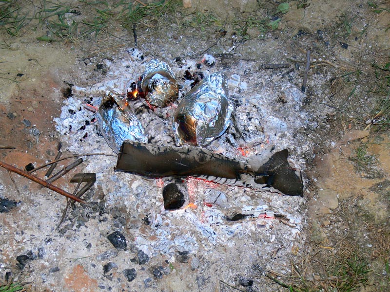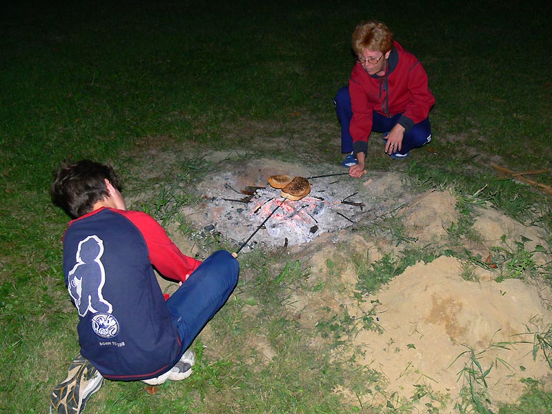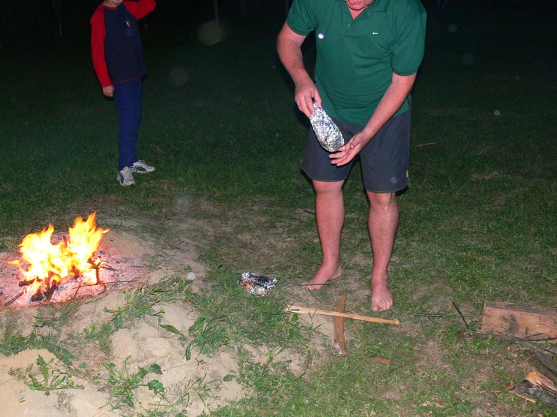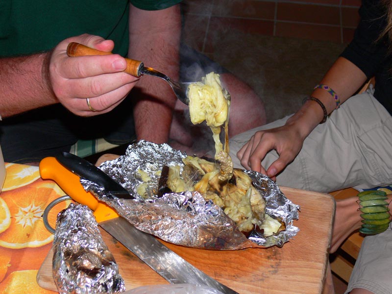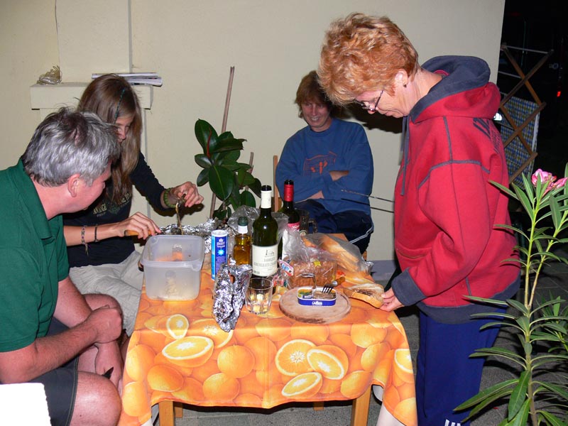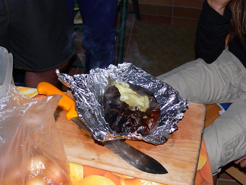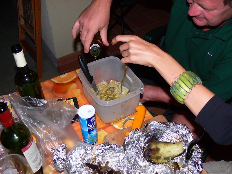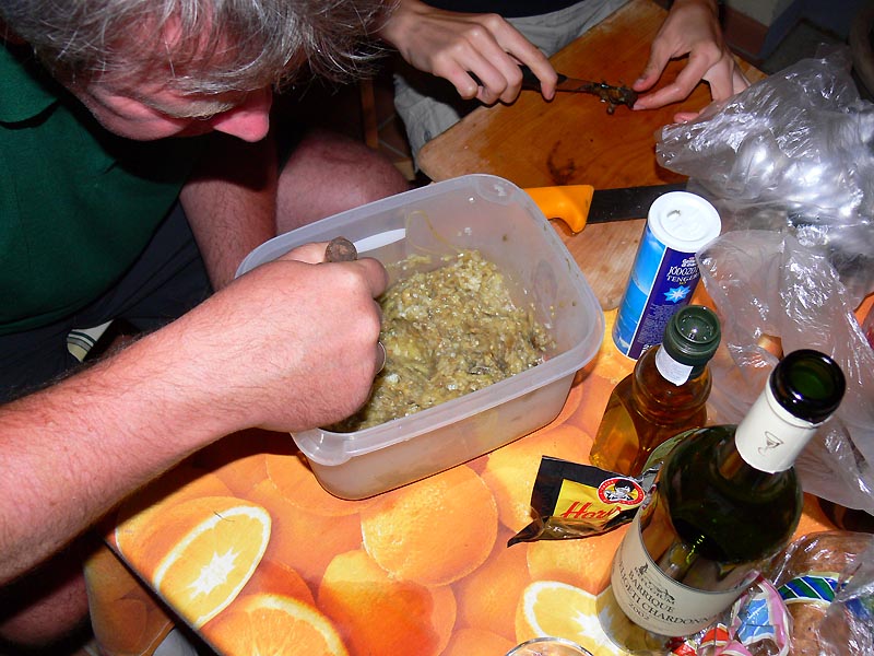 Na nem mintha nem lenne teljesen mindegy a helyszín, a képeken semmi nem látszik az egy hétre bérelt helyes kis falusi nyaralóból - de hidd el hogy ott történt! 2007-es közös nyaralásunkon Zoli barátom készítette el nekünk jól bevált gasztronómiai mesterművét, ami már régen a kedvencemmé vált: padlizsán-pástétomot pirítóssal. A szokásosnál több képpel illusztrálom a jeles eseményt. A padlizsánokat parázson, fóliába csomagolva megpárolta. Ezután a héjából kikanalazta és olajjal, hagymával, borssal és még ki tudja mivel összekeverte. (A képen a fűszerek között látható több üveg bor indirekt módon ízesíti az eledelt: élénkíti a szakács fantáziáját, előkészíti az ízlelőbimbókat és az éhes gyomrok pH értékét.) Közben a bámészkodók közül az időben eszmélők nekiálltak kenyeret pirítani. Utána lehetett is kenni a kenyérre. Csúszott rá a jó kis fehérbor ! Isteni vacsora egy fárasztó túrával telt nap végére. A maradék sem veszett kárba: reggel hidegen (mint Matula bácsi halászlé-kocsonyája) pirítósra kenve is mennyei volt.