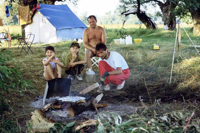 Biztos vagyok benne hogy sokunknak kedvence volt-van-lesz ez a hely. Most olyan fotókat mutatok róla, amelyek a '80-as - '90-es években láttatják a tájat. Akkor még legelőként működött, a gát Rákóczifalva felőli tövében volt egy marhaistálló. A vízpart tulajdonképpen attól volt fürdésre alkalmas, hogy a tehenek rendszeresen letaposták, így a növényzet nem nőtte be. Később a tehenek elmaradtak, csak a szénát gyűjtötték. A vízparti liget különösen alkalmas volt a táborozásra, nyáron hét közben is volt mindig egy-két sátor, hét végén pedig sok. Mostanra nagyon megváltozott minden, a várkonyi vízkivételi művel szembeni sarkantyút kikotorták, így az egykori ligetes rész alatti part meredekké vált - viszont a sarkantyú helyén alakul ki egy rövidebb, de igen lapos homokos pad, remek fürdőhely. A fák között már régen nem a lelegelt, pázsitszerű fű az úr, hanem az elvadult bokrok. Néhány éve kilátót, tanösvényt építettek ide, kerékpárutat, szemeteseket. A várkonyi öregasszony, Boriska néni által "meghajtott" egykori faladikos rév utódjaként átkelőhajóval is próbálkoztak - nem tudom ezzel most mi lehet? Nekünk maradtak az emlékek. A családi legendatár gyöngyszeme, hogy jó negyedszázada Marci fiam itt látván először eleven tehenet alaposan szemügyre vette, aztán elismerően jegyezte meg: