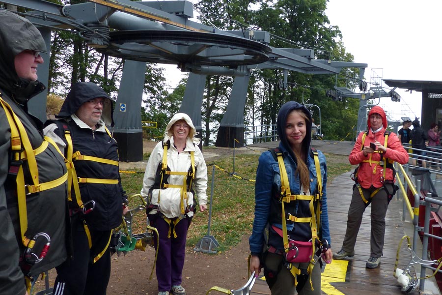 fel a hegytetőre. Itt mérlegelés (max. 120 kg), hevederek és görgők kiosztása,